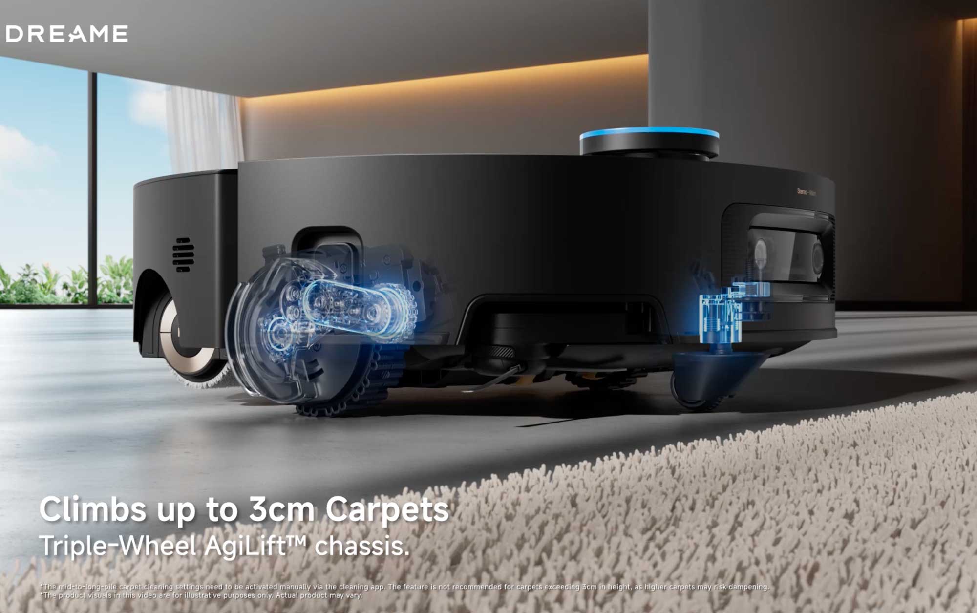 Dès qu’un tapis est détecté, le robot commence par relever légèrement son châssis grâce au système ProLeap, qui lui permet de s’élever de quelques millimètres.