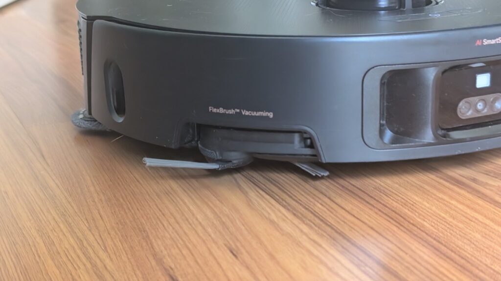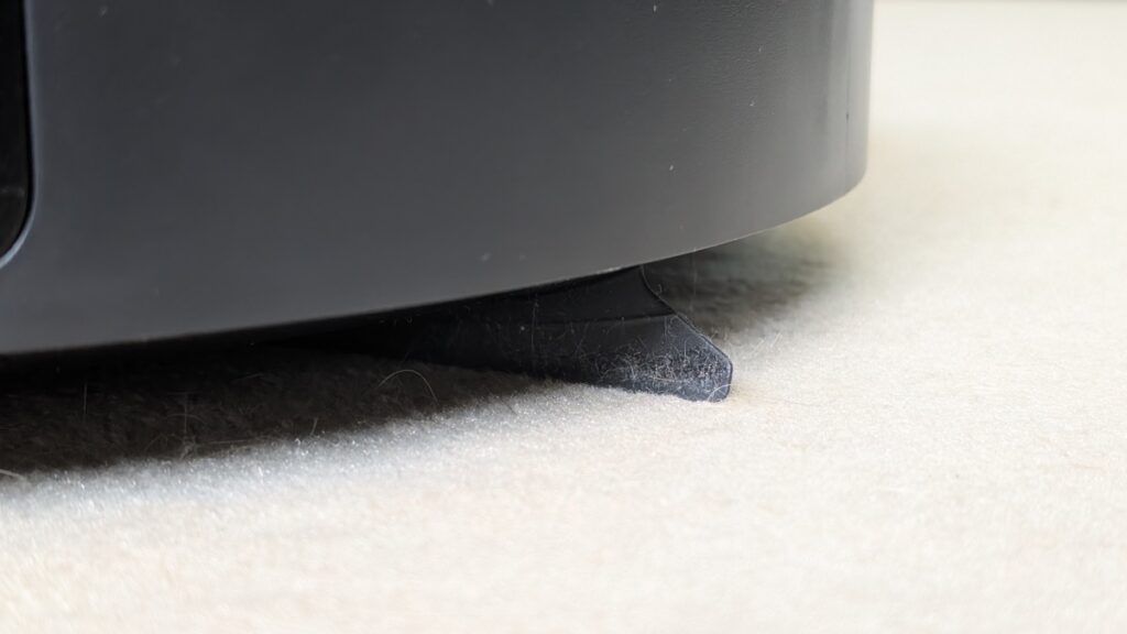 Comme tous ses congénères, le Z50 Ultra se dote d’une brossette latérale extensible pour rapatrier vers son ventre les déchets nichés dans les coins et le long des murs. Celle-ci se montre très efficace. Sa vitesse de rotation est bien dosée et s’adapte au degré de saleté du sol. Une bonne solution qui évite d’éjecter au loin les gros débris comme des grains de litière agglomérés. Nous avons par ailleurs apprécié la possibilité de la mettre en œuvre également sur moquette. Une option absente sur les derniers modèles de Roborock par exemple et qui permet pourtant de bien nettoyer le long des murs également sur ces surfaces.