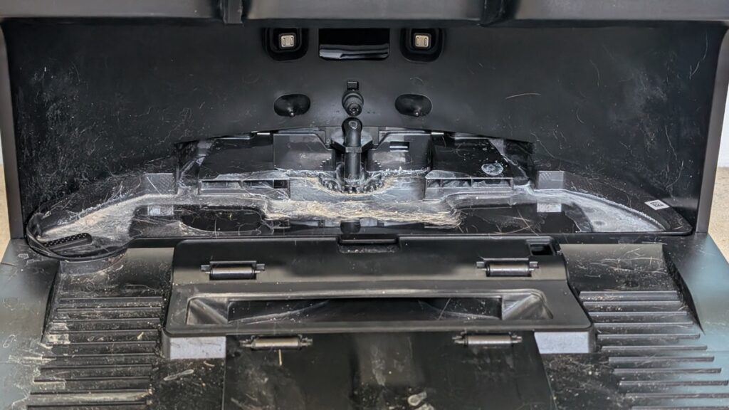 La station se révèle assez simple à manipuler. Mova y a intégré un système d’auto-nettoyage automatique à lancer depuis l’appli. Et heureusement, puisque la planche de lavage a tendance à s’encrasser assez rapidement. Poils, cheveux et autres débris s’y accumulent pouvant boucher les grilles d’évacuation d’eau. Le résultat n’est pas parfait et il faut passer régulièrement un bon coup de chiffon.