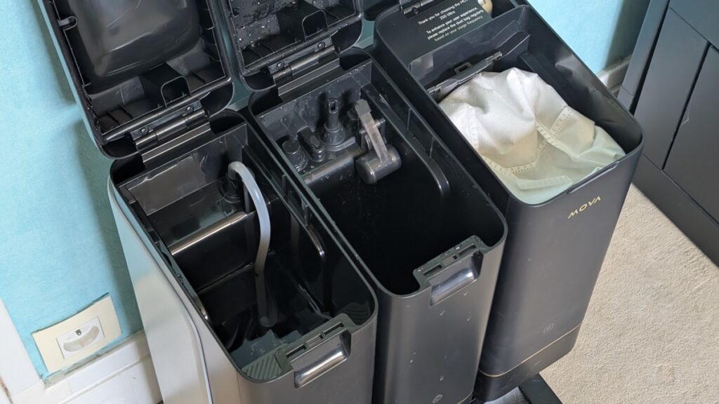 Heureusement, Mova répond à cette critique avec un réservoir d’eau sale entièrement amovible. Situé à l’arrière du robot, il peut être retiré facilement et nettoyé au robinet après chaque cycle. Ce simple changement améliore nettement l’hygiène au quotidien et limite les risques de stagnation d’eau ou de développement bactérien.