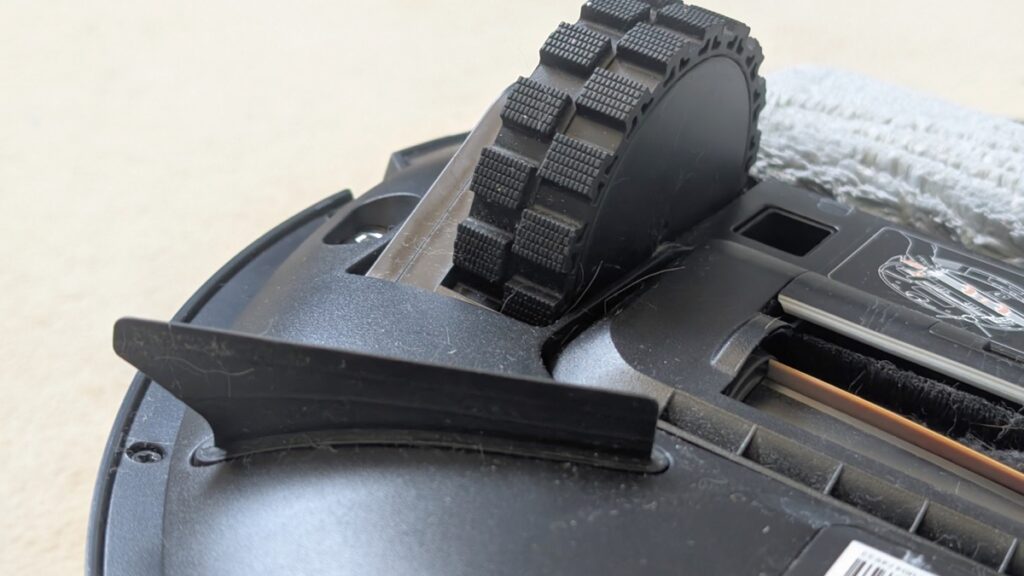 C’est le principal point noir de ce Z50 Ultra. Mova a fixé sous le châssis, près de la roue droite, une sorte de raclette en silicone de 7 cm de long. Elle touche presque systématiquement le sol lorsque le robot se déplace. Son but ? Difficile à déterminer. Elle semble là avant tout pour récupérer par ricochet les débris envoyés par la brossette latérale placée sur le flanc opposé.
