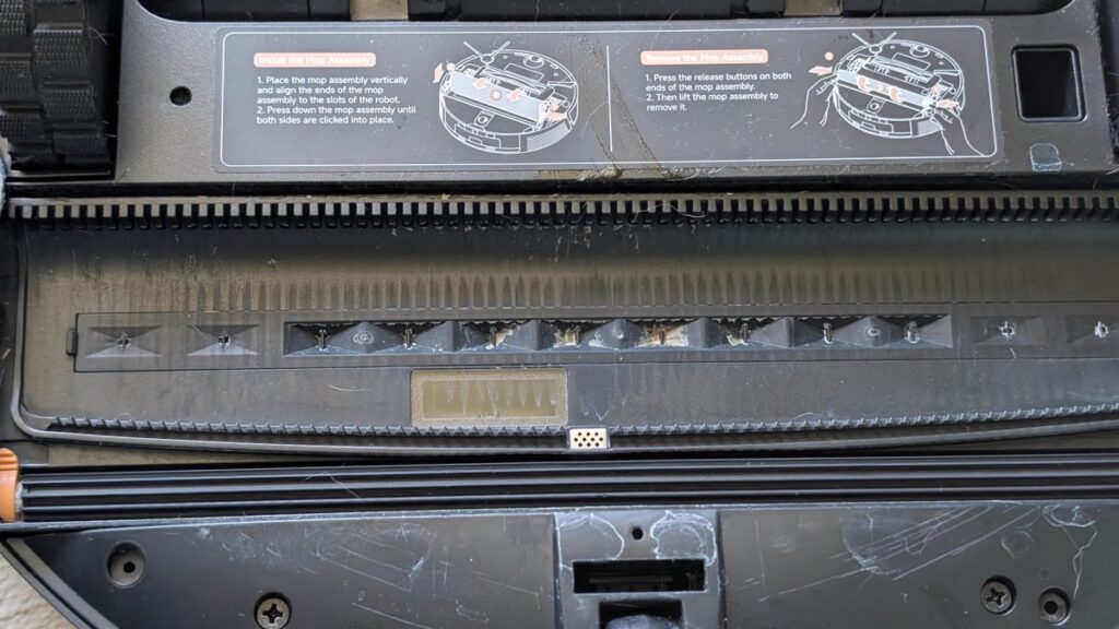 Attention car le rouleau serpillère n’est pas très docile. Il est difficile de le retirer et plus encore de le remettre en place. Plus d’une fois une alerte vocale (avec un fort accent québécois alors que le robot émet ses autres alertes en français) nous a indiqué qu’il était bien positionné, ce qui était faux.