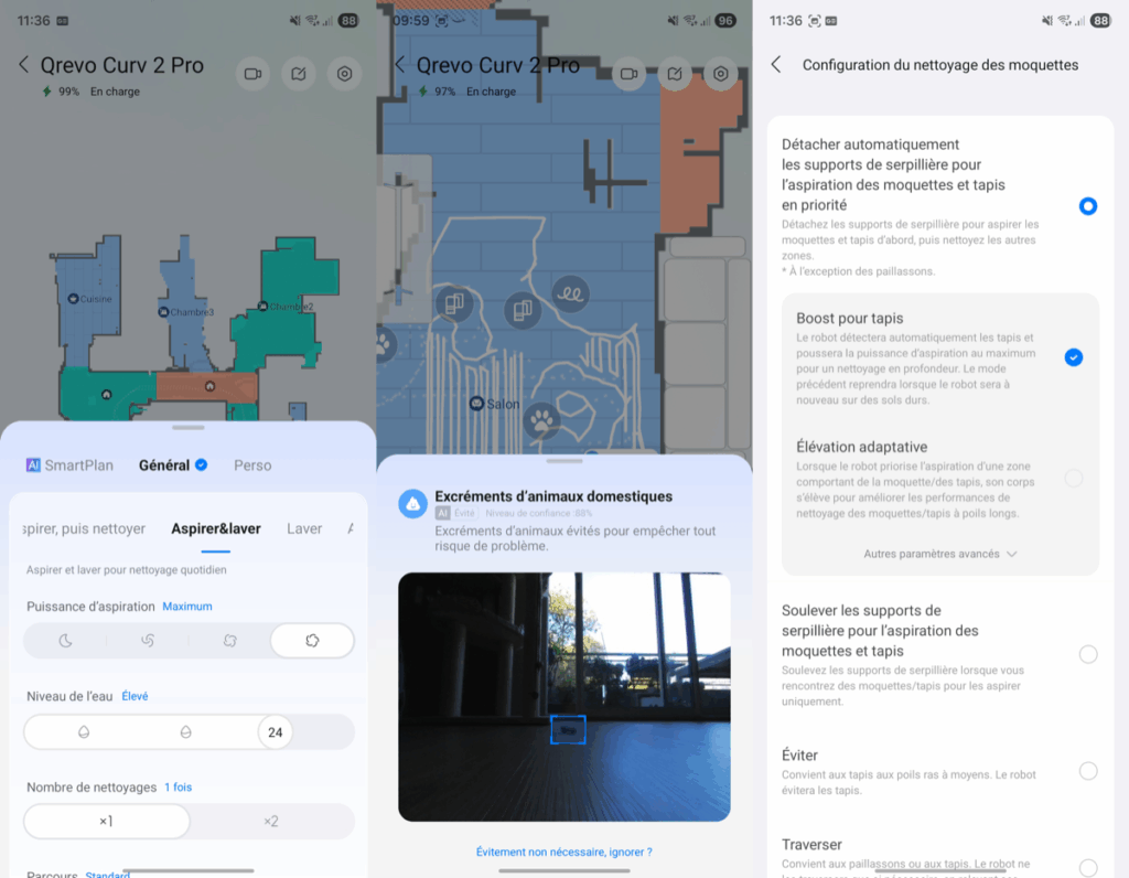 Il est aussi possible de régler le comportement que le robot doit adopter envers les tapis, de lui faire prendre des photos des obstacles rencontrés comme des animaux, de le faire partir en vadrouille pour surveiller la maison en votre absence, etc. C’est agréable, bien expliqué et sans menus à rallonge. Il est juste regrettable que l’on ne puisse intervenir d’aucune façon sur le mode SmartPlan, histoire de le rendre plus pertinent.