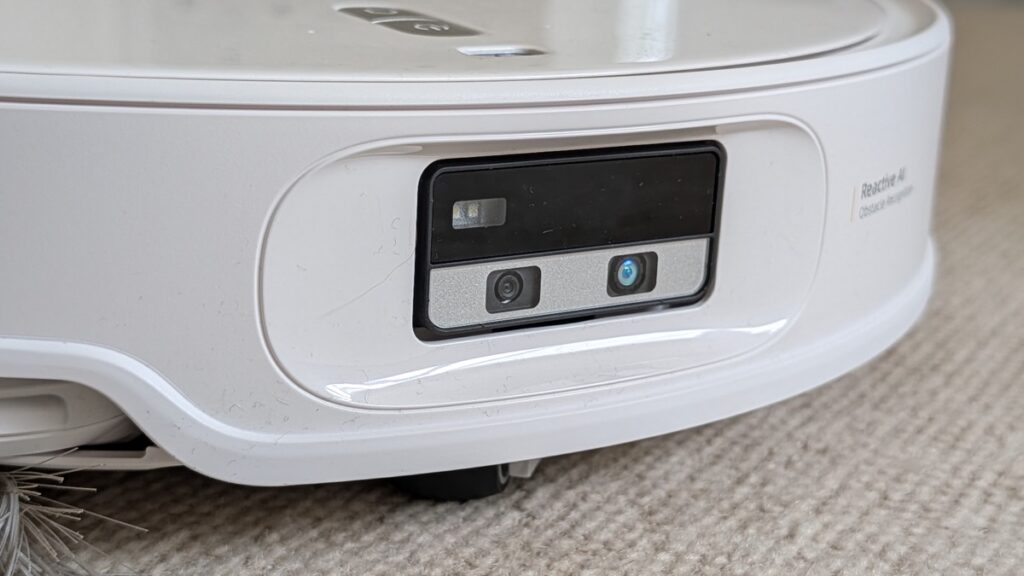 À l’avant, on retrouve la traditionnelle caméra RVB épaulée par l’intelligence artificielle maison, Reactive AI. Le flanc droit se pare d’un capteur laser de proximité lui donnant la possibilité a priori de longer les câbles serpentant au sol.
