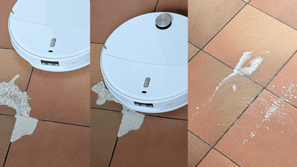 Quant au nettoyage des taches fraîches, il ne réussit pas à tenir tête aux modèles équipés de rouleau serpillère, bien plus efficaces dans cet exercice. Durant notre test, le robot a correctement identifié la présence de sauce liquide répandue sur le carrelage. Néanmoins, il a laissé sa brossette latérale tourner dedans. On aurait aimé qu’il puisse la rétracter pour éviter de la salir. Après un premier passage suivi d’un aller-retour à la station pour laver les patins, le robot et effectuer un second lavage, le robot a estimé que c’était suffisant. Mais malgré l’utilisation d’eau chaude collectée à la station, le sol était encore collant et pas vraiment propre. Dommage.