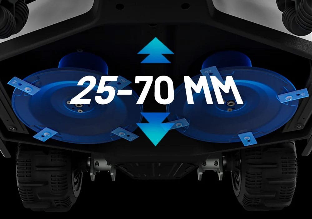 Le Mammotion Luba 2 AWD X utilise deux disques équipés chacun de six lames, soit 12 au total. Cela offre une largeur de coupe de 400 mm, l’une des plus généreuses du marché. Cette largeur permet de couvrir les grandes surfaces rapidement, tout en maintenant un rendu homogène, même sur herbe haute ou mouillée.