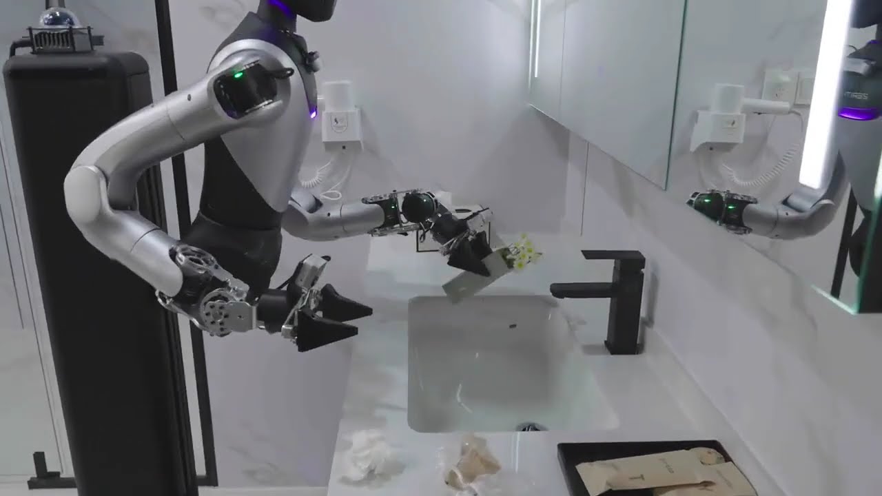 Les vidéos montrent un robot qui glisse, vide la poubelle, repose les serviettes ou le gel douche, sans aide humaine.